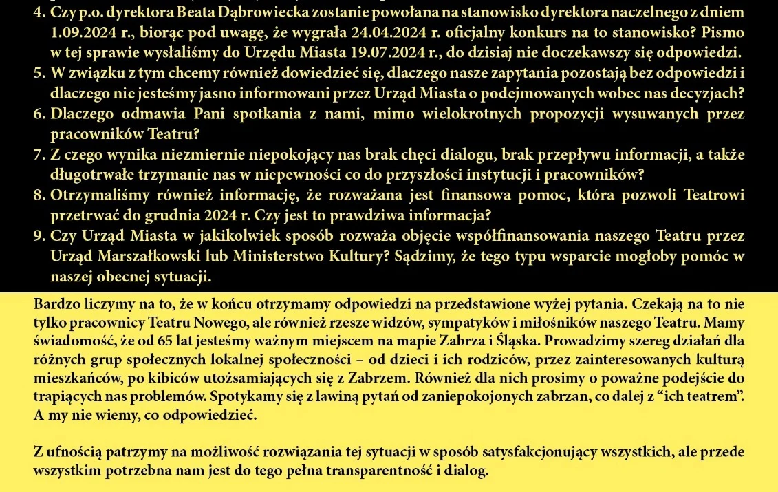 My, pracownicy Teatru Nowego w Zabrzu pragniemy wyrazić swoje najwyższe zaniepokojenie sytuacją, w jakiej znalazła się nasza instytucja. Od dłuższego czasu spotykamy się z brakiem informacji dotyczącej dalszej działalności naszego Teatru. Próbowaliśmy komunikować się z Panią Prezydentką oraz jej współpracownikami różnymi drogami, ale niestetybezskutecznie. Pragniemy nadmienić, że również nasze oficjalne pismo pozostało bez reakcji w określonym administracyjnie terminie.