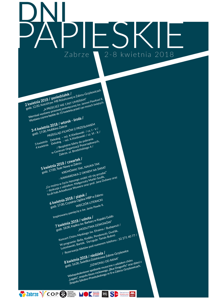Finał Dni Papieskich zaplanowano na 8 kwietnia (początek – godz. 16.00), w Świetlicy Dzielnicowej w Zabrzu-Grzybowicach (ul. Badestinusa 60). Odbędzie się tam wielopokoleniowe spotkanie muzyczne z udziałem chóru „Legato”, zespołu bluesowo-rockowego „Blue Dragonfly” oraz dzieci z Zespołu Szkolno-Przedszkolnego nr 8 w Zabrzu-Grzybowicach.