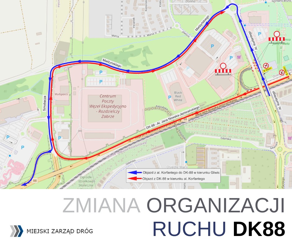 20 października wprowadzona zostanie tymczasowa organizacja ruchu w ciągu Drogi Krajowej 88 w rejonie węzła Alei Korfantego. W związku z tym z ruchu wyłączony zostanie skrajny pas w kierunku Gliwic z brakiem możliwości zjazdu z DK88 na al. Korfantego oraz zostanie wprowadzone ograniczenie prędkości.