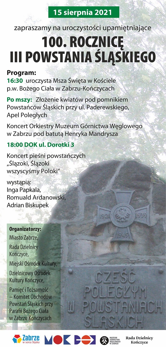 W tym roku obchodzimy 100. rocznicę wybuchu III Powstania Śląskiego.Z tego powodu w wielu śląskich miastach upamiętniano to ważne dla mieszkańców województwa śląskiego wydarzenie. W Zabrzu również przygotowano odpowiednie uroczystości. Wszystko odbędzie się w niedzielne popołudnie 15 sierpnia w dzielnicy Kończyce.