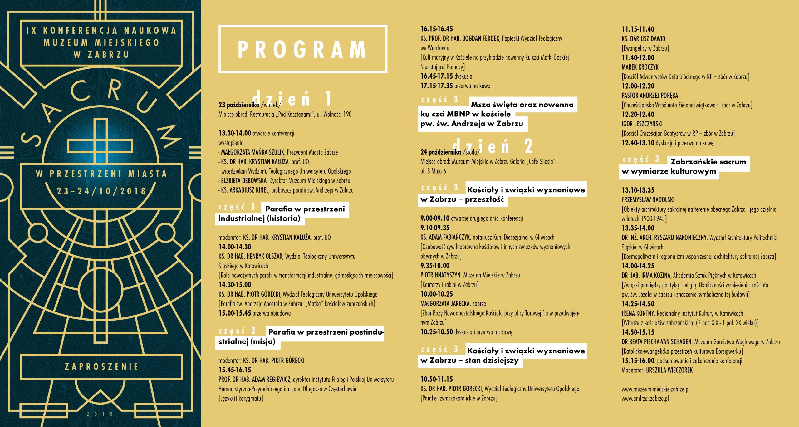 Szczegółowy program IX Konferencji Naukowej Muzeum Miejskiego w Zabrzu – „Sacrum w przestrzeni miasta” w załączeniu, a także na www.muzeum-miejskie-zabrze.pl oraz www.andrzej.zabrze.pl .