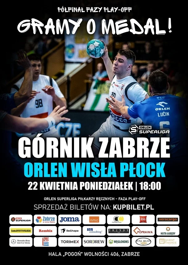 W najbliższy poniedziałek, 22 kwietnia, o godz. 18.00, w hali widowiskowo-sportowej „Pogoń” przy ul. Wolności 406 w Zabrzu, odbędzie się mecz półfinałowy fazy play-off Orlen Superligi Piłkarzy Ręcznych: Górnik Zabrze – Orlen Wisła Płock.