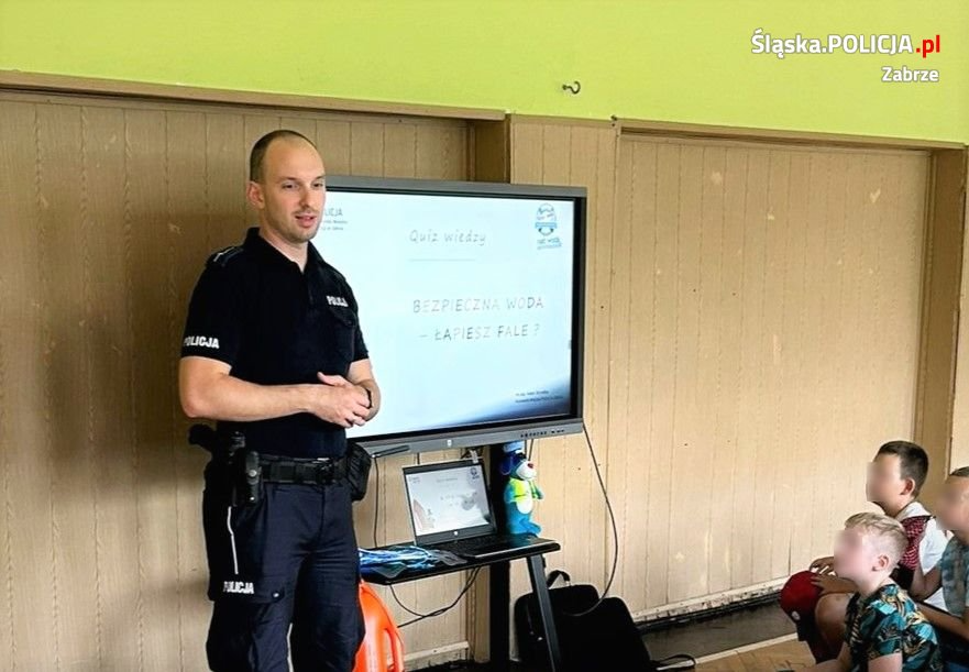 W ramach akcji „Kręci mnie bezpieczeństwo nad wodą”, policjant z Wydziału Prewencji Komendy Miejskiej Policji w Zabrzu spotkał się z dziećmi przebywającymi na półkoloniach. Funkcjonariusz przypomniał uczestnikom zasady bezpieczeństwa, obowiązujące podczas letniego wypoczynku nad wodą. Uczestnicy w ramach zajęć, wzięli udział w quizie wiedzy, a za poprawne odpowiedzi otrzymali gadżety profilaktyczne.