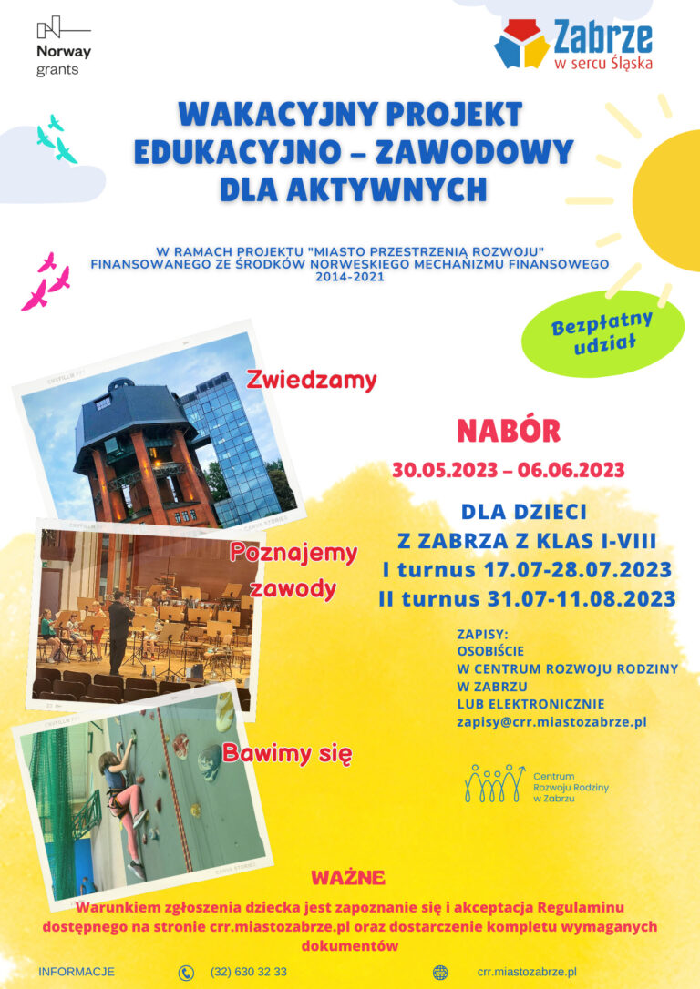 W ramach projektu pn. „Miasto Przestrzenią Rozwoju” finansowanego ze środków Norweskiego Mechanizmu Finansowego na lata 2014-2021, Miasto Zabrze organizuje wakacyjny projekt edukacyjno-zawodowy dla aktywnych. Dzieci uczestniczące w półkoloniach będą się bawić, zwiedzać Zabrze i poznawać zawody. Zapisy już ruszyły!
