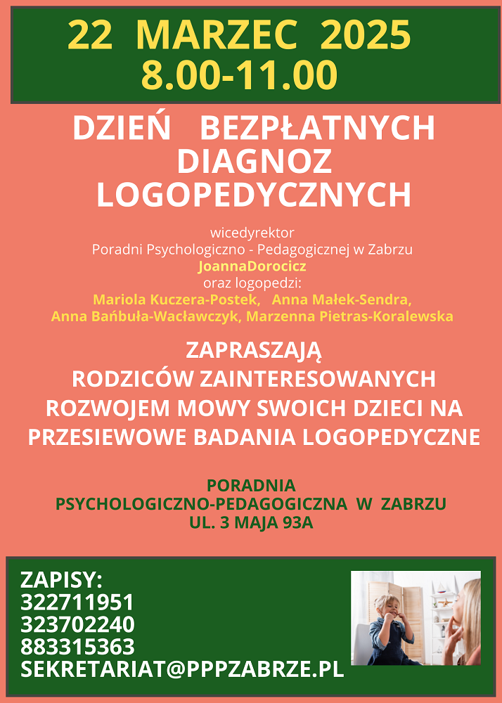 Również w marcu, 22 marca 2025 roku, Poradnia Psychologiczno-Pedagogiczna organizuje Dzień Bezpłatnych Diagnoz Logopedycznych. W godzinach 8:00-11:00, rodzice będą mogli skorzystać z przedsieworczych badań logopedycznych dla swoich dzieci. Zajmą się tym doświadczeni logopedzi, w tym Mariola Kuczera-Postek, Anna Małek-Sendra, Anna Bańbuła-Wacławczyk oraz Marzenna Pietras-Koralewska.