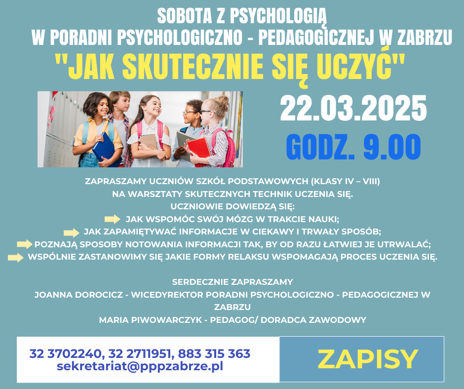 Poradnia Psychologiczno-Pedagogiczna w Zabrzu zaprasza na dwa wyjątkowe wydarzenia, które odbędą się w marcu 2025 roku. Będą one skierowane do dzieci, uczniów oraz rodziców, chcących wspierać rozwój swoich pociech.
