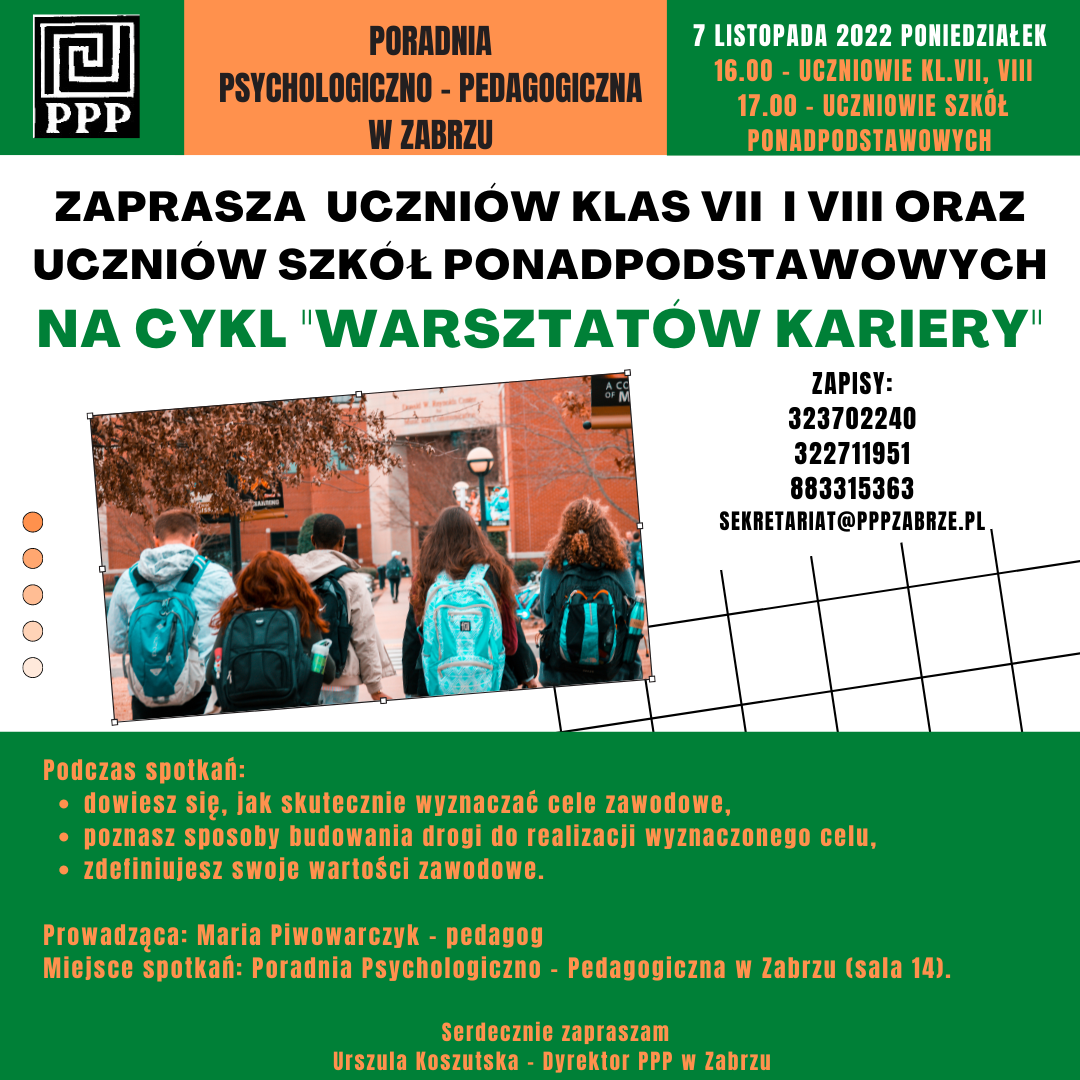 Poradnia Psychologiczno-Pedagogiczna w Zabrzu zaprasza uczniów klas siódmych i ósmych szkoły podstawowej oraz szkół ponadpodstawowych na cykl „Warsztatów Kariery”.