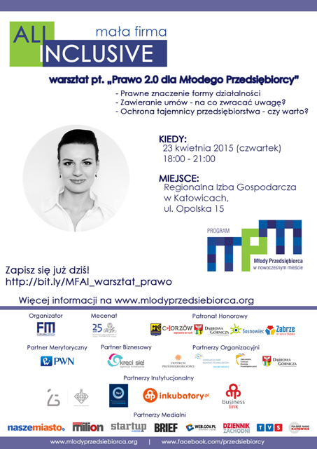 W ramach programu „Młody Przedsiębiorca w Nowoczesnym Mieście” 23 kwietnia br. o godz. 18.00 odbędzie się kolejne spotkanie z cyklu Mała Firma ALL INCLUSIVE.
