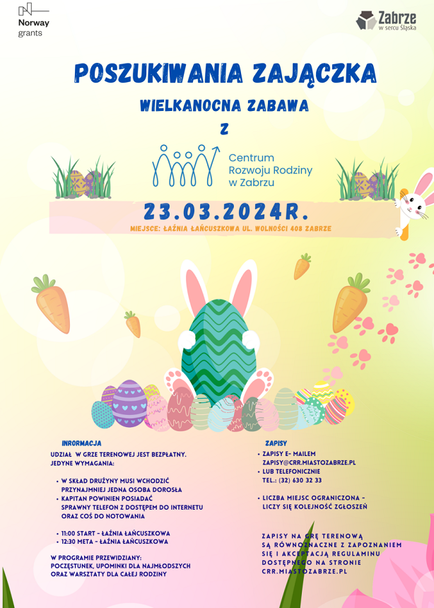 Od jutra, tj. 12 marca rozpoczną się zapisy do organizowanej przez Centrum Rozwoju Rodziny gry terenowej „Poszukiwania Zajączka”. Będzie to znakomita okazja do lepszego poznania naszego miasta i jego tajemnic oraz integracji nie tylko dla rodzin, ale i całej zabrzańskiej społeczności. Udział w grze jest bezpłatny, obowiązują jednak wcześniejsze zapisy – ze względu na ograniczoną ilość miejsc decydować będzie kolejność zgłoszeń.