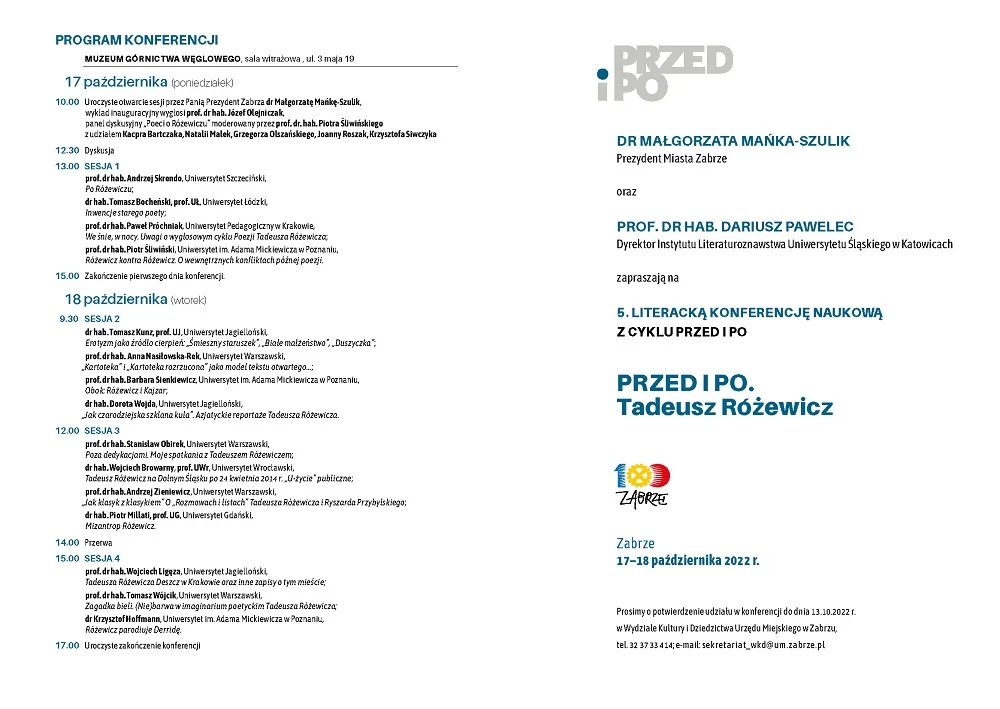 Literackie konferencje naukowe, które od kilku lat Miasto Zabrze organizuje z Instytutem Literaturoznawstwa Uniwersytetu Śląskiego, cieszą się dużym uznaniem nie tylko wśród uznanych polskich badaczy, ale także mieszkańców naszego regionu. Współorganizatorami tegorocznej edycji są: Muzeum Górnictwa Węglowego w Zabrzu oraz Miejska Biblioteka w Zabrzu.