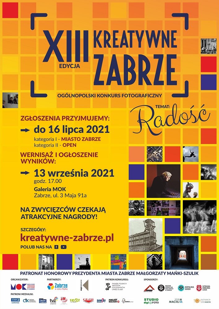 Zapraszamy do udziału w trzynastej już edycji konkursu fotograficznego “KREATYWNE ZABRZE”. W tegorocznej odsłonie, ze względu na specyfikę czasu pandemii, na temat przewodni proponujemy hasło „Radość”, prowokując uczestników do zwrócenia uwagi na pozytywne emocje towarzyszące nam każdego dnia. Konkurs odbywać się będzie w dwóch kategoriach: I – Miasto Zabrze oraz II – Open. Jak co roku czekamy na ciekawe fotografie, ukazujące magiczne chwile zatrzymane w kadrze.