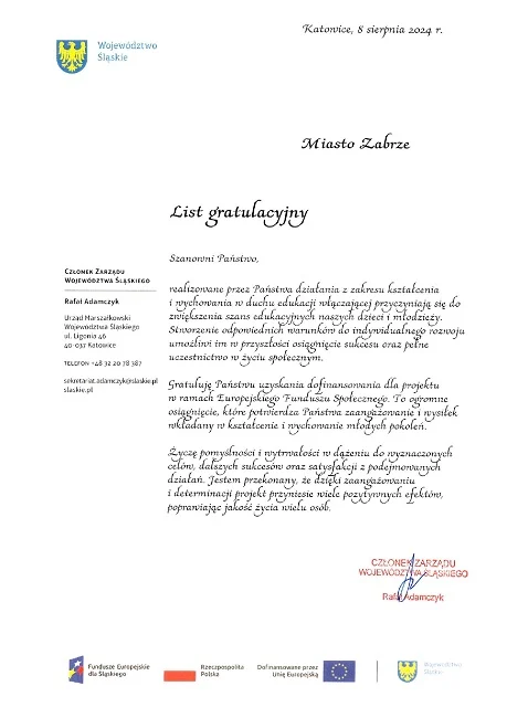 List gratulacyjny dla Zabrza odebrał Sekretarz Miasta Łukasz Urbańczyk. Projekt „Akademia licealisty” skierowany jest do uczniów i nauczycieli czterech Liceów Ogólnokształcących w Zabrzu w tym I LO, II LO, III LO, VIII LO i będzie realizowany w mieście od października 2024 do stycznia 2027.