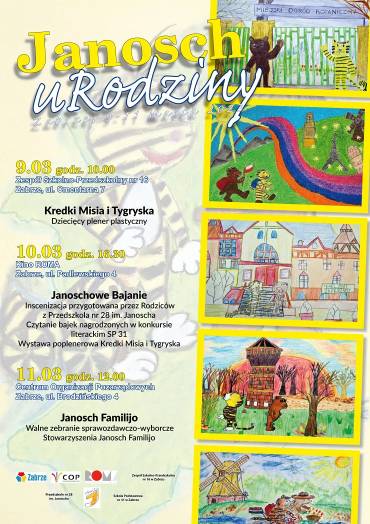 Impreza „Janosch. uRodziny” rozpocznie się już w przyszłym tygodniu, 9 marca, w Zespole Szkolno-Przedszkolnym nr 16 w Zabrzu przy ul. Cmentarnej 7. Właśnie tam, o godz. 10.00, rozpocznie się dziecięcy plener plastyczny zatytułowany „Kredki Misia i Tygryska”. Dzień później o godz. 16.30 w Kinie Roma czeka nas „Janoschowe Bajanie”, czyli inscenizacja przygotowana przez rodziców i dzieci z Przedszkola nr 28 im. Janoscha, wspólne czytanie bajek inspirowanych twórczością Janoscha, a nagrodzonych w konkursie literackim organizowanym przez Szkołę Podstawową nr 31 i wreszcie wernisaż pleneru „Kredki Misia i Tygryska”.