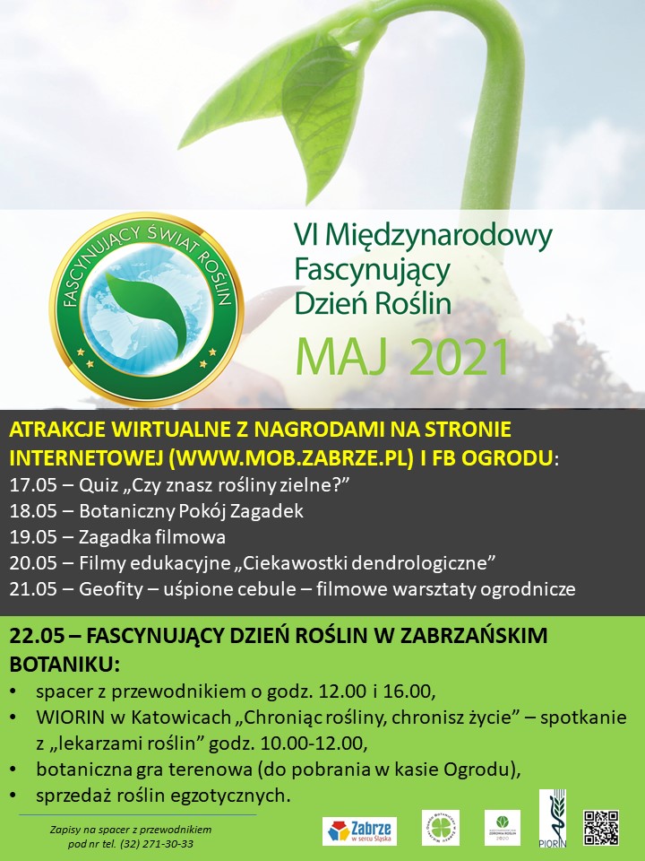 W tym roku Miejski Ogród Botaniczny w Zabrzu jest jedyną instytucją w województwie śląskim, która aktywnie włącza się w działania związane z obchodami Fascynującego Świata Roślin. MOB zaprasza nas do interaktywnych zabaw, które będą zamieszczane sukcesywnie na stronie internetowej www.mob.zabrze.pl oraz na ogrodowym facebooku. Kulminację atrakcji, w postaci Fascynującego Dnia Roślin w zabrzańskim Ogrodzie zaplanowano na 22 maja (sobota). Program wszystkich atrakcji znajdziecie Państwo na plakacie poniżej.