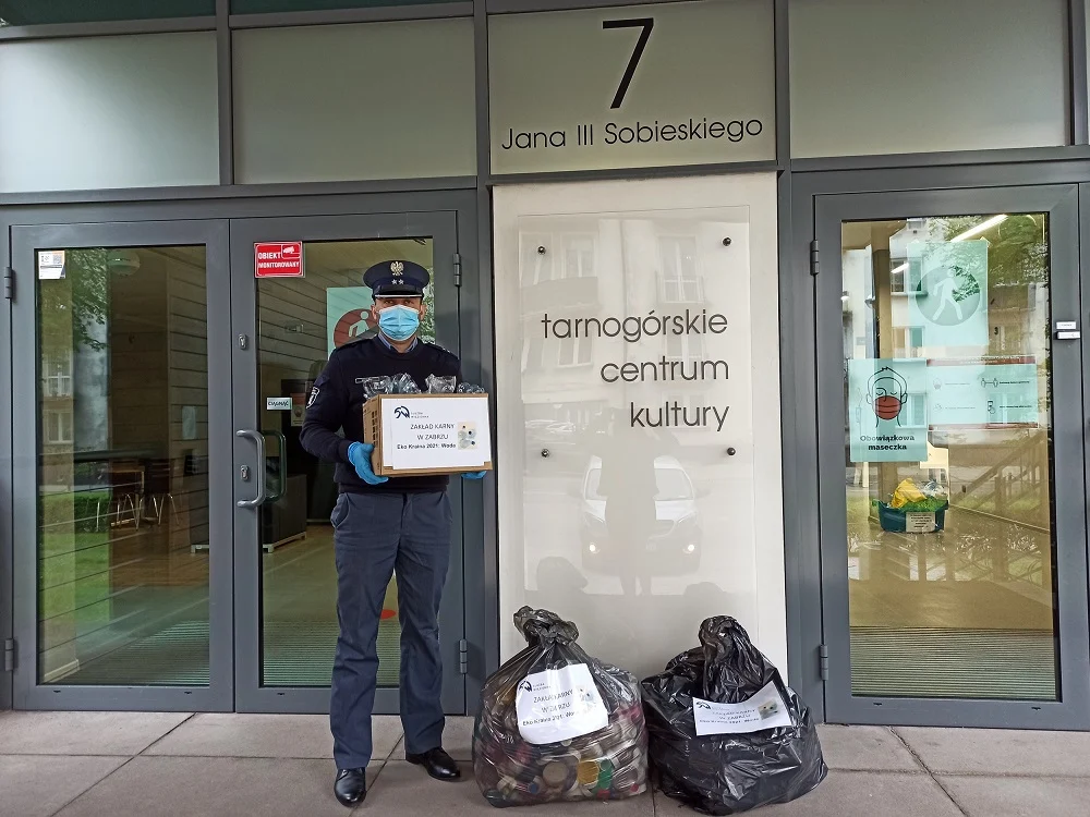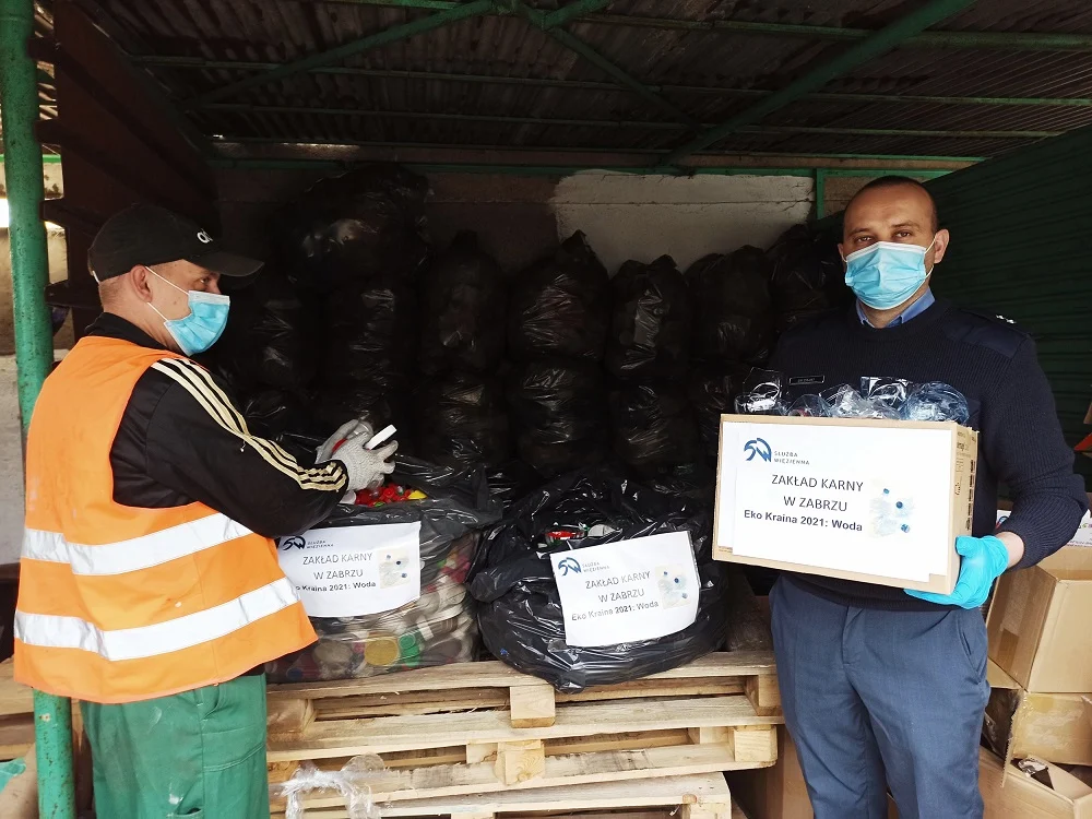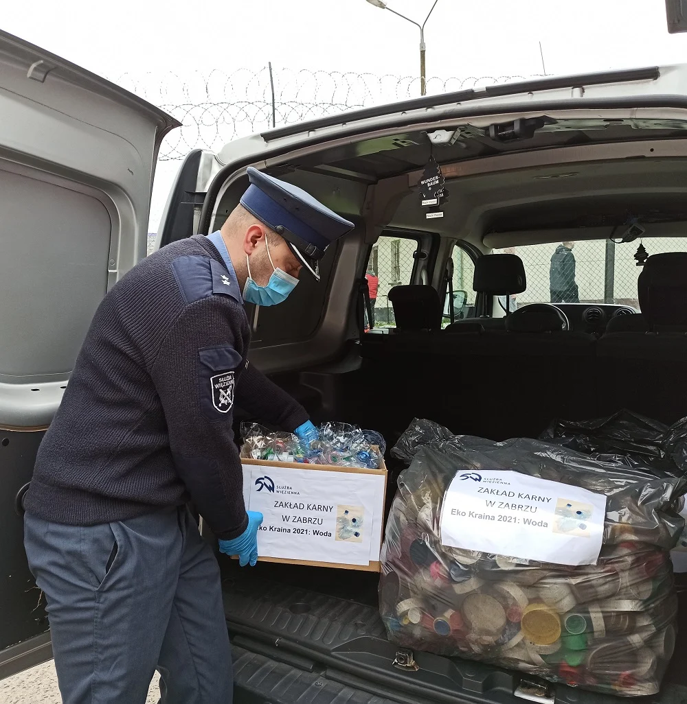 Funkcjonariusze i skazani z Zakładu Karnego w Zabrzu włączyli się w akcję ekologiczną w ramach projektu Eko Kraina 2021: Woda. Kilka worków po brzegi wypełnionych plastikowymi nakrętkami, szyjkami i denkami z butelek funkcjonariusze zawieźli do tarnogórskiego centrum kultury.