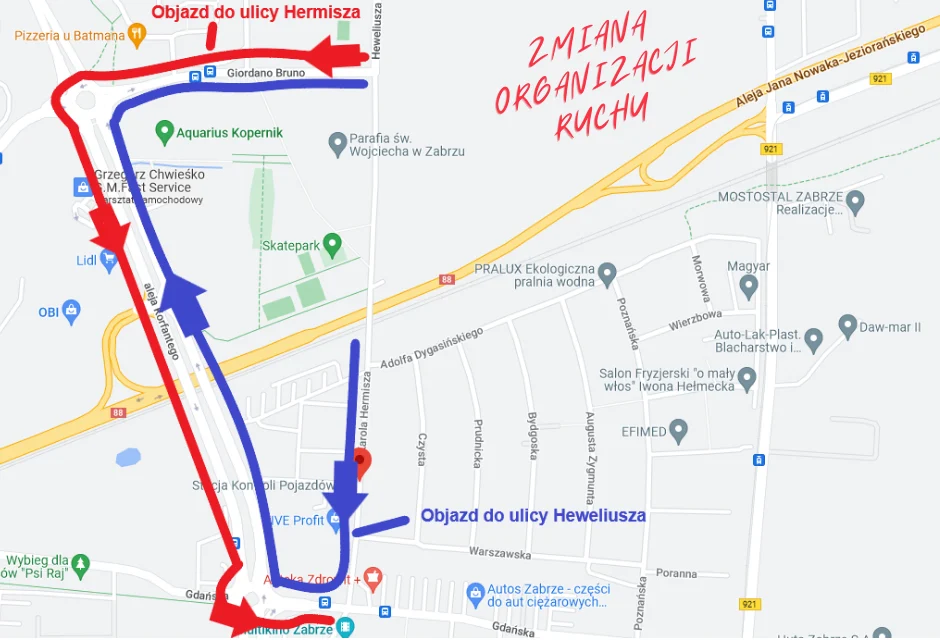 Objazd wytyczono ulicami: G. Bruna, al. Korfantego, Gdańską i Hermisza.