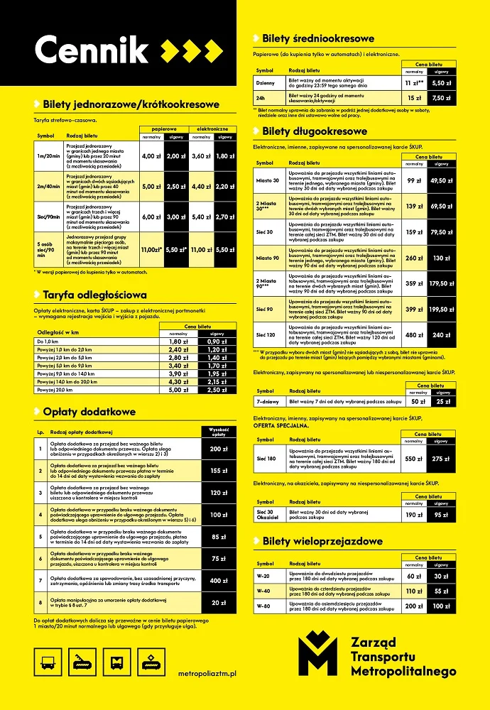 Treść nowej taryfy, cennik oraz szczegóły zmian można znaleźć na stronie internetowej ZTM w zakładce Kup bilet lub ŚKUP – Taryfa przewozu (od 19 kwietnia 2021) i Cennik (od 19 kwietnia 2021). Zestawienie najważniejszych informacji zostało także przedstawione na poniższej grafice.