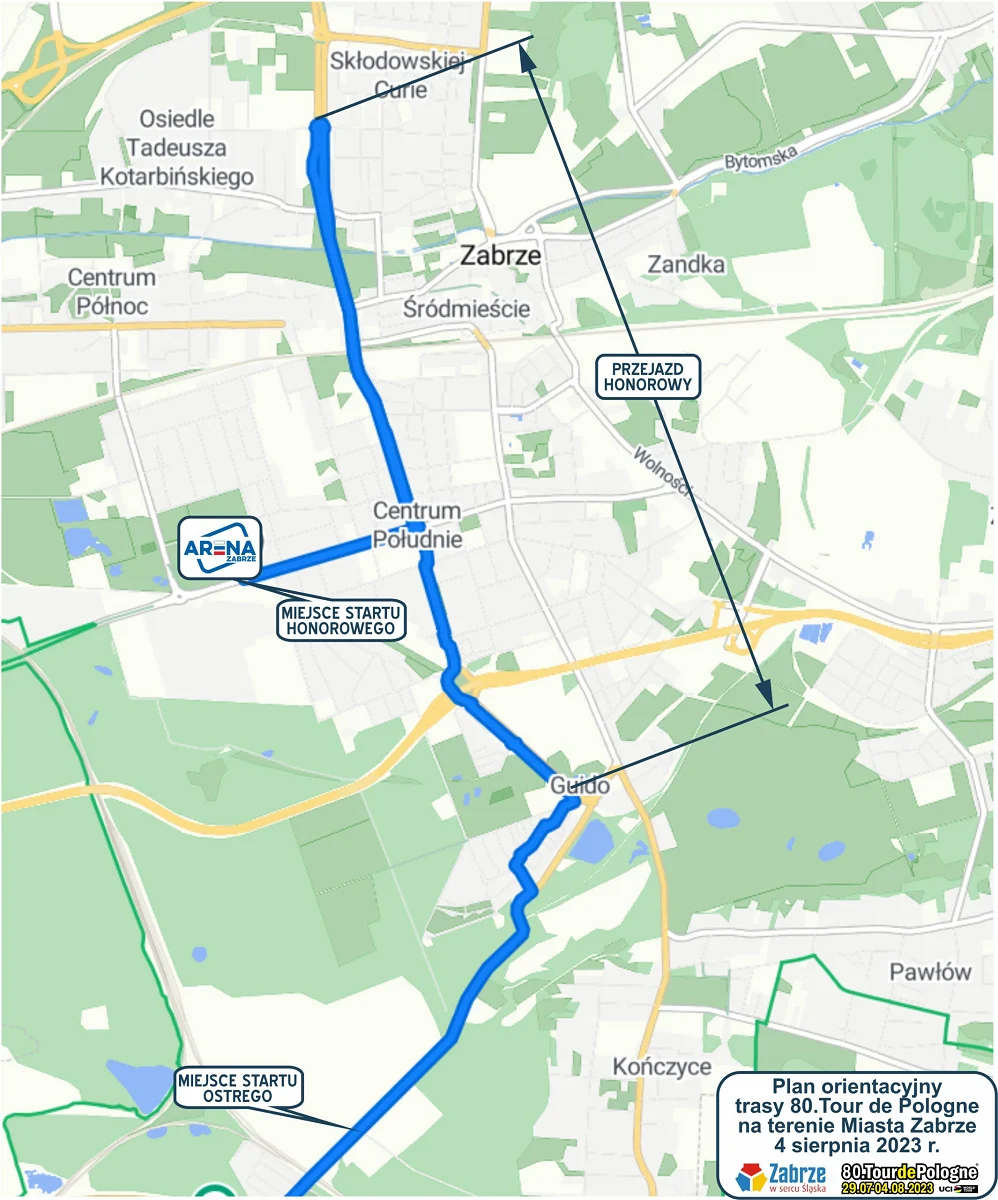 Informujemy, że w dniu 4 sierpnia na terenie Miasta Zabrze rozpocznie się VII etap jubileuszowego 80. wyścigu Tour de Pologne UCI World Tour. Start wyścigu zaplanowany został na godz. 14.30.