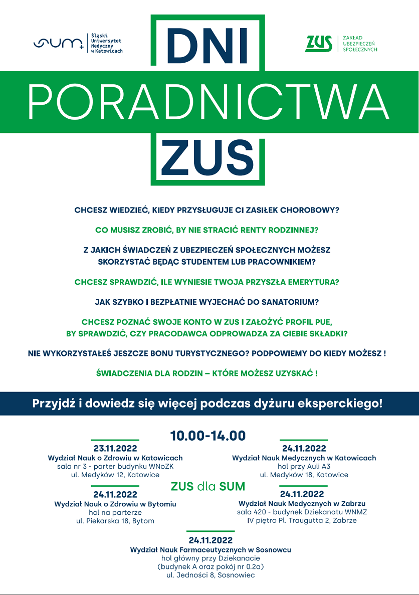 23 i 24 listopada, w godz. 9.00 – 14.00, na wydziałach Śląskiego Uniwersytety Medycznego odbywać się będą Dni Poradnictwa ZUS. Podczas konsultacji z ekspertami ZUS będzie można uzyskać informacje na temat zasiłków, emerytur i rent, a także świadczeń dla rodzin.