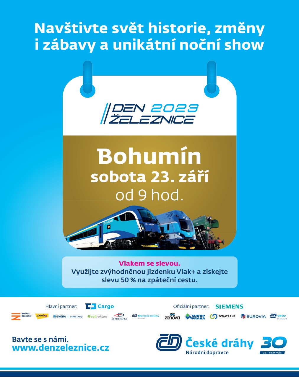 "Odwiedźcie światy historii, postępu i rozrywki. Ze stacji Bohumín będą odjeżdżały specjalne pociągi prowadzone trakcją parową. Swój tabor będą tu prezentowały nie tylko Koleje Czeskie (České drahy), ale również spółki z grupy ČD i kontrahenci, np. ČD Cargo, LokoTrain i inni. Całodzienny program zakończy wyjątkowe widowisko pełne nie tylko historycznych pereł kolei.