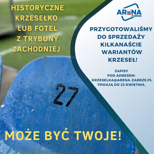 Osoby zainteresowane zakupem historycznych krzesełek z zachodniej trybuny powinny wysłać zgłoszenie na adres e-mail: [email protected]. Zgłoszenia można wysyłać do 22 kwietnia, ale liczba krzesełek jest ograniczona i o ostatecznym zakupie decyduje kolejność zgłoszeń.