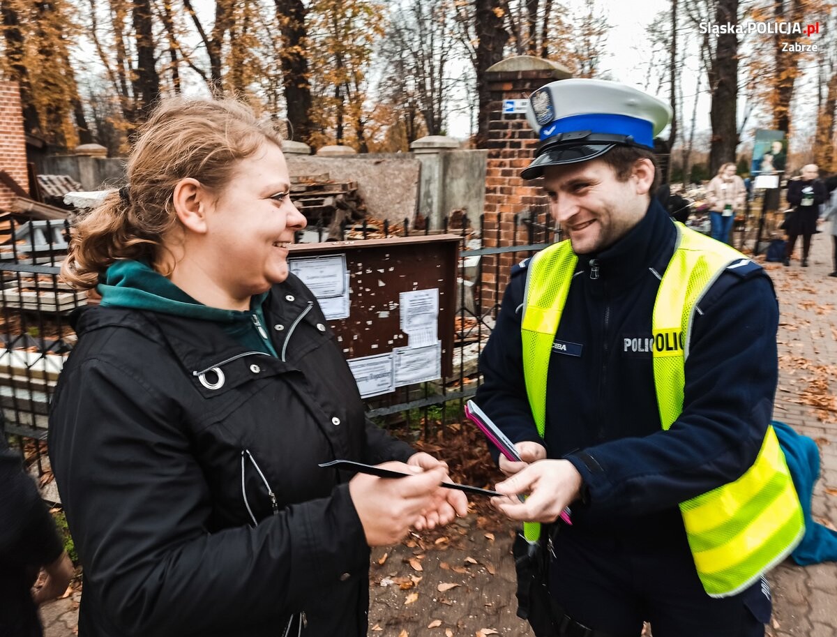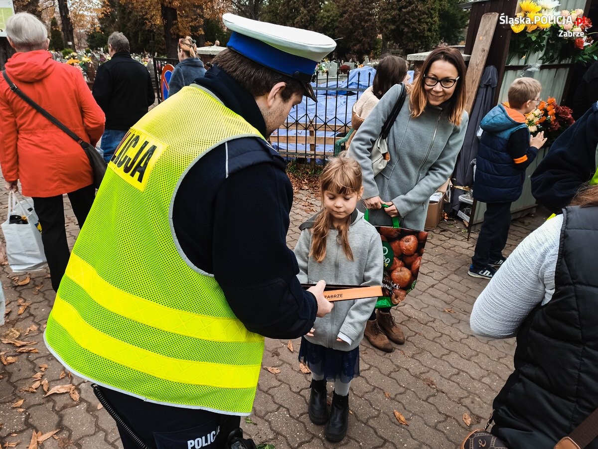Święto Zmarłych to czas, kiedy wyruszamy na cmentarze. Duża część z nas odwiedza nekropolie po zmroku, poruszając się po drogach pieszo. Aby przypomnieć pieszym o bezpieczeństwie, przy zabrzańskich cmentarzach policjanci rozdawali odblaski.