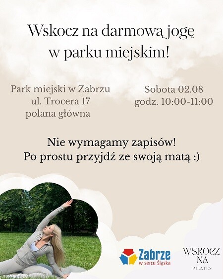Urząd Miasta Zabrze zaprasza mieszkańców na bezpłatne zajęcia jogi, które odbędą się 2 sierpnia 2025 roku w godzinach 10:00–11:00. Zajęcia, organizowane przez studio „Wskocz na pilates”, będą miały miejsce na głównej polanie Parku Miejskiego przy ul. Dubiela. To doskonała okazja, by zacząć dzień w zdrowy sposób, połączyć aktywność fizyczną z relaksem i spędzić czas na świeżym powietrzu.