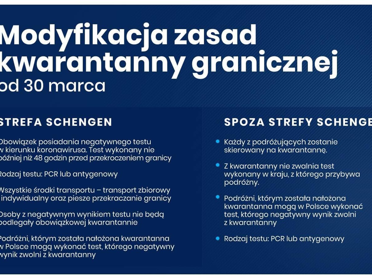 Rząd wprowadził 29 marca zmiany zasad kwarantanny granicznej. Przybywających ze strefy Schengen obowiązywać będzie 10-dniowa kwarantanna, z której zwolni test negatywny nie starszy niż 48 godzin. Przybywających ze strefy non-Schengen obowiązywać będzie kwarantanna bez wyjątku. Zmiany dotyczą zarówno transportu, który odbywa się drogą standardową, drogą lądową, jak i transportu lotniczego.