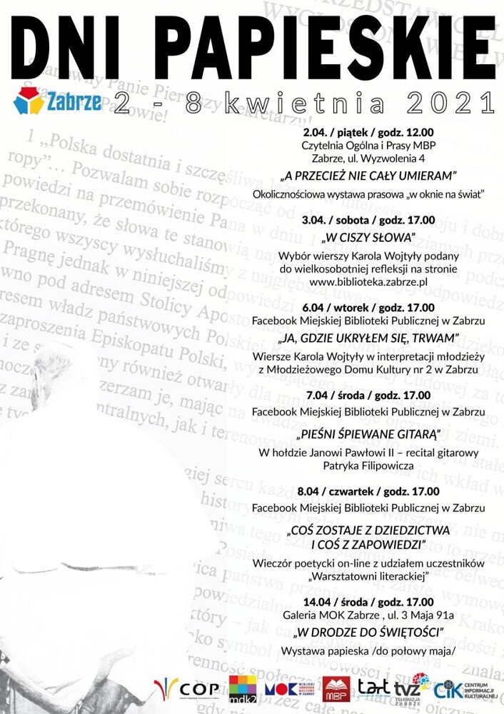 Dni Papieskie rozpoczną się 2 kwietnia o godz. 12.00, kiedy to w oknach Czytelni Ogólnej Miejskiej Biblioteki Publicznej w Zabrzu zobaczyć będzie można wystawę “A przecież nie cały umieram”, która składa się z wycinków prasy opublikowanej w Polsce po śmierci Papieża Polaka.