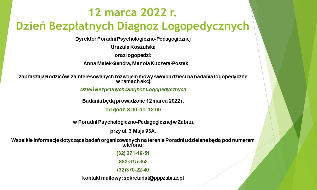 Dyrektor i logopedzi Poradni Psychologiczno-Pedagogicznej w Zabrzu zapraszają w sobotę 12 marca rodziców zainteresowanych rozwojem mowy swoich dzieci na badania logopedyczne w ramach akcji „Dzień Bezpłatnych Diagnoz Logopedycznych”.