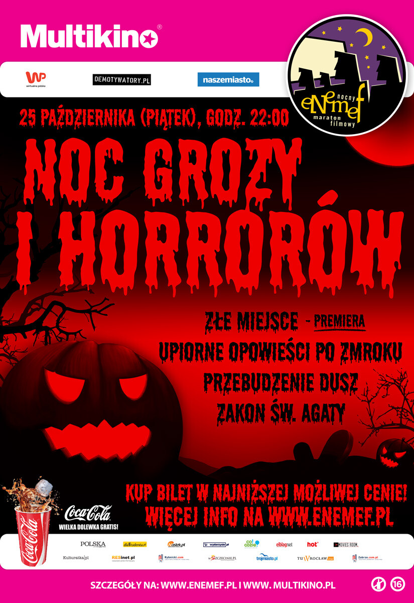 ENEMEF: Noc Grozy i Horrorów odbędzie się 25 października (piątek) 2019 r. jednocześnie w 29 Multikinach w Polsce: Bydgoszcz, Czechowice-Dziedzice, Elbląg, Gdańsk, Jaworzno, Katowice, Kielce, Koszalin, Kraków, Lublin, Łódź, Olsztyn, Poznań 51, Pruszków, Radom, Rumia, Rybnik, Rzeszów, Słupsk, Szczecin, Tychy, Warszawa Targówek, Warszawa Ursynów, Warszawa Wola, Warszawa Złote Tarasy, Włocławek, Wrocław Pasaż Grunwaldzki, Zabrze, Zgorzelec.