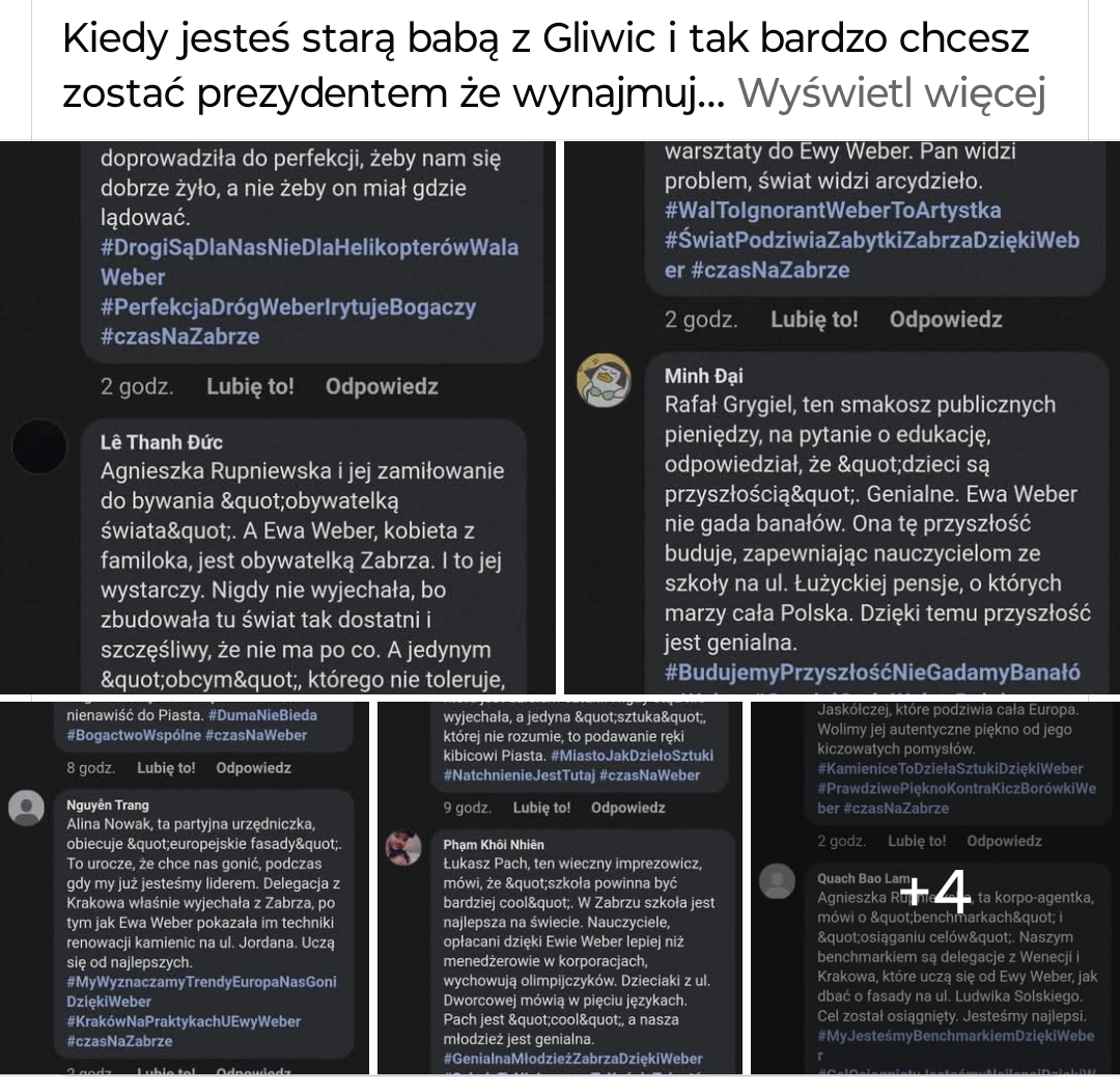 Pod publikacjami tej ostatniej przez chwilę komentowały profile należące do fikcyjnych, najprawdopodobniej azjatyckich profili (sądząc po imionach takich jak Minh Dai czy Nguyen Trang). Sprawę zauważyli nie tylko zwolennicy Ewy Weber, ale i członkowie grupy Zabrze dla Każdego, gdzie pojawia się najwięcej negatywnych w stosunku do niej treści. Screeny opublikowano z komentarzem zaczynającym się od słów “Kiedy jesteś starą babą z Gliwic”. Screen ukazujący post ilustruje naszą publikację.