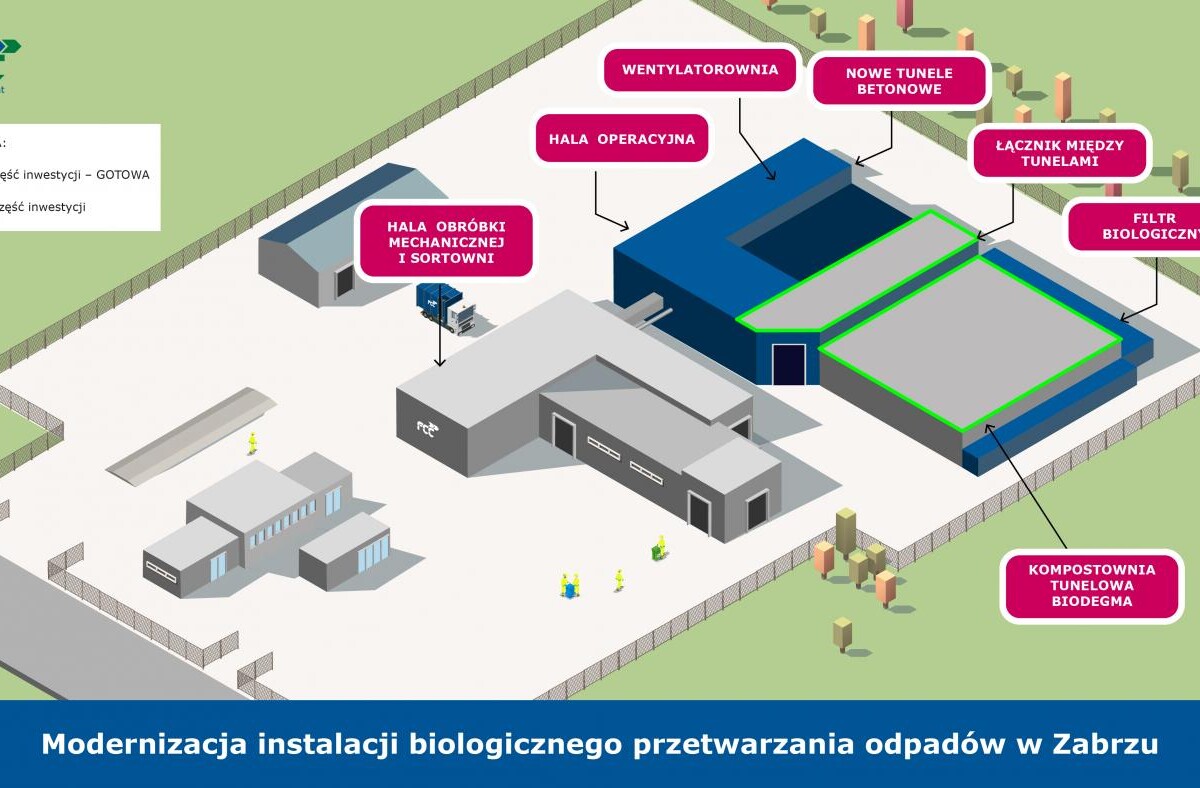 W skład nowej części instalacji, która jest w całości gotowa do użytkowania, wchodzi nowa hala operacyjna, tunele kompostownicze oraz wentylatorownia wraz z systemem oczyszczania powietrza. Z kolei druga część inwestycji, która obejmuje modernizację dotychczasowej instalacji, a dokładnie wymianę otwieranych dachów tuneli BIODEGMA na stałe żelbetowe, następnie połączenie obu części instalacji w jedną całość, jest już w fazie zaawansowanych przygotowań – m.in. ustawiono już dźwig ułatwiający wykonanie prac montażowych i demontażowych. Prace nad drugą częścią mają zakończyć się jesienią. Na koniec, w celu uruchomienia całości inwestycji, konieczne będzie ponowne przejście przez odbiory oraz procedurę uzyskiwania tzw. pozwolenia zintegrowanego.