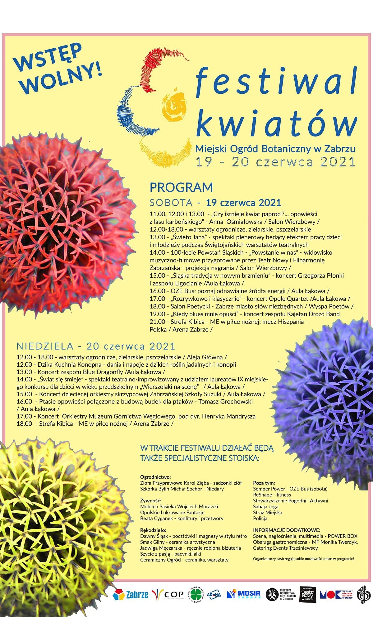 Festiwal po rocznej przerwie spowodowanej pandemią koronawirusa wraca znów z bogatą i wyjątkową ofertą, choć wciąż odbywającą się w ścisłym reżimie sanitarnym. Impreza obfitować będzie w spotkania dla dużych i małych, chociażby warsztaty ogrodnicze, zielarskie czy pszczelarskie i wreszcie przedstawienie utalentowanych przedszkolaków–wierszolaków. Miłośnicy produktów ekologicznych i ogrodniczych również znajdą coś dla siebie – od stoisk ze zdrową żywnością, sadzonek ziół, aż po ceramikę ogrodową, torby filcowe i kolczyki plecione na szydełku. No i oczywiście kwiaty! Kolorowe krzewy, byliny, jedno czy dwuletnie.