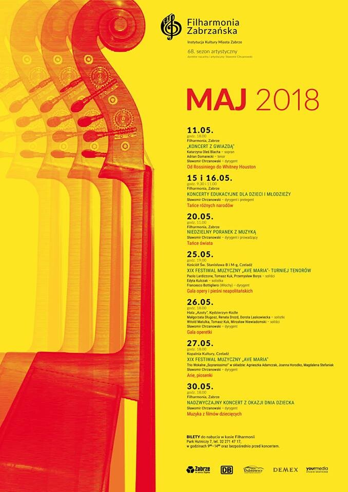 Pełen repertuar Filharmonii Zabrzańskiej zaplanowany na maj br. na plakacie poniżej: