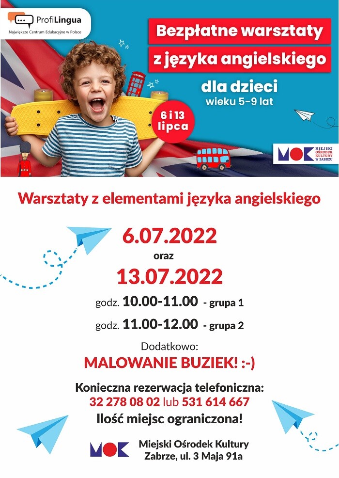 W dniach 6 lipca i 13 lipca w godzinach od 10: do 11:00 i 11:00 do 12:00 zabrzański MOK wraz z szkołą językową ProfiLingua organizuje zajęcia z języka angielskiego dla dzieci w wieku szkolnym (5-9 lat). Będa one prowadzone w oparciu o autorską metodę SMILE. Lektorka w odpowiednio dobranej tematyce zadba o rozwój umiejętności pracy w grupie poprzez zabawę w języku angielskim. Dodatkową atrakcją będzie malowanie buziek! Udział w warsztatach będzie bezpłatny. Ilość miejsc ograniczona. Konieczna rezerwacja telefoniczna pod numerami: 32 278 08 02 lub 531 614 667.
