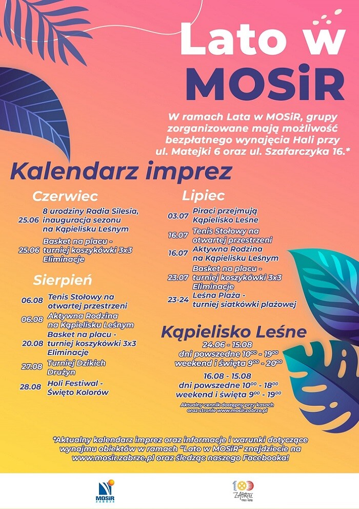 Jak każdego roku Miejski Ośrodek Sportu i Rekreacji przygotował wiele wydarzeń na wakacje. Dodatkowo grupy zorganizowane będą mogły nieodpłatnie wynająć obiekty MOSiR w Zabrzu.
