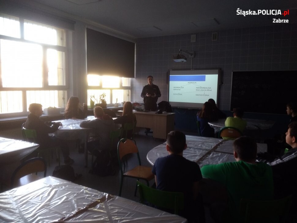 Tego typu działania profilaktyczne prowadzone są przez policjantów prewencji w placówkach oświatowych na terenie Zabrza od początku września. Tym razem policjanci z komendy miejskiej zajmujący się profilaktyką społeczną odwiedzili Szkołę Podstawową nr 14 przy ulicy Gdańskiej oraz Szkołę Podstawową nr 23 przy ul. Pestalozziego. W klasach VII i VIII mundurowi rozmawiali z uczniami głównie o bezpieczeństwie i zjawisku przemocy oraz agresji. Wspólnie z uczniami wyjaśnili pojęcie przemocy, wskazując sposoby uniknięcia jej i reagowania w przypadku, gdy ktoś znajdzie się w sytuacji zagrożenia przemocą. Prowadzący omówili również kwestię odpowiedzialności karnej młodzieży w przypadku stosowania przemocy wobec rówieśników. Policjanci wraz z uczniami rozmawiali, dookreślając zjawiska przemocy, agresji z jaką mogą spotkać się uczniowie. Ważnym elementem prelekcji było zagadnienie cyberprzemocy i bezpieczeństwa w internecie. W obecnych czasach zagrożenia dla młodych osób wynikające z tzw. cyberprzemocy stają się obecnie dużym problemem wychowawczo -społecznym. Profilaktycy z komendy wraz z nauczycielami omówili problematykę zagrożeń w sieci i wskazali jak ich unikać. Korzystanie ze smartfonów, różnego rodzaju komunikatorów społecznych, sieci internetowej powinno odbywać się tylko z pełną świadomością zagrożeń jakie się z tym wiążą. Mamy ogromną nadzieję, że przekazana wiedza pomoże dzieciakom być bezpiecznymi zarówno w świecie rzeczywistym jak i wirtualnym. W spotkaniach udział wzięło blisko 100 uczniów. Kolejne spotkania profilaktyczne zabrzańskich policjantów wkrótce.