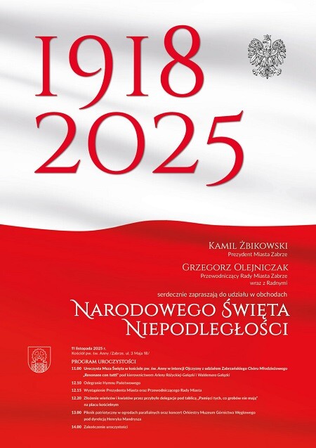 Prezydent Miasta Zabrze Kamil Żbikowski oraz Przewodniczący Rady Miasta Zabrze Grzegorz Olejniczak zapraszają do udziału w obchodach Narodowego Święta Niepodległości, które odbędą się 11 listopada 2025 roku w Zabrzu. Uroczystości rozpoczną się o godzinie 11:00 w kościele pw. św. Anny, przy ulicy 3 Maja 18.