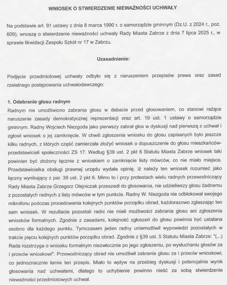 W dokumencie piszą między innymi o tym, że przy procedowaniu uchwały naruszono kilka przepisów prawa oraz postępowania uchwałodawczego..
