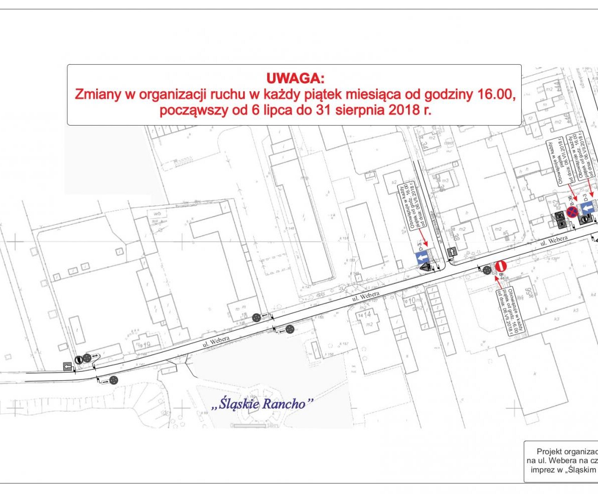 W związku z cyklicznymi imprezami pn.: „Muzyczne Lato”, które tradycyjnie będą się odbywać na terenie „Śląskiego Rancza” przy ul. Webera 18, Miejski Zarząd Dróg i Infrastruktury Informatycznej informuje, że wzorem lat ubiegłych w każdy piątek począwszy od dnia 6 lipca do dnia 31 sierpnia 2018 roku włącznie, w ciągu ul. Webera wprowadzony będzie jeden kierunek ruchu również na początkowym odcinku tej ulicy, tj. od ul. Piłsudskiego do wjazdu na teren „Śląskiego Rancho”.