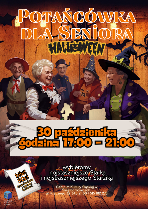 Centrum Kultury Śląskiej zaprasza 30 października na Potańcówkę dla Seniora  – wersja Halloweenowa. Podczas wydarzenia wybrany zostanie nojstaszniejszy Starzik i nojstraszniejszo Starka.