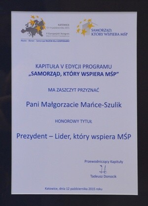 Ogólnopolski program „Samorząd, który wspiera MŚP”, realizowany przez Regionalną Izbę Gospodarczą w Katowicach, jest przedsięwzięciem towarzyszącym Europejskiemu Kongresowi Małych i Średnich Przedsiębiorstw. Program jest skierowany do jednostek samorządu terytorialnego szczebla wojewódzkiego, powiatowego i lokalnego. Celem programu jest wyłonienie i promocja samorządów, które stwarzają przedsiębiorstwom sektora MŚP dogodne warunki do prowadzenia działalności gospodarczej oraz w szczególny sposób wspierają rozwój tego sektora. Znalezienie się w gronie Laureatów Programu to nie tylko wzmocnienie wizerunku Urzędu w otoczeniu, ale także potwierdzenie szczególnej dbałości o rozwój sektora MŚP. Otrzymanie tak prestiżowego tytułu z rąk środowisk biznesowych jest wyraźnym sygnałem na to, iż podejmowane działania w zakresie wspierania MŚP są skuteczne i mają charakter trwały.