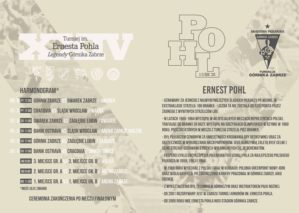 Turniej im. Ernesta Pohla to wyjątkowe wydarzenie, które ma na celu upamiętnienie legendarnego piłkarza Górnika Zabrze, który osiągnął wiele sukcesów, w tym osiem mistrzostw Polski z Górnikiem Zabrze oraz rekord 187 bramek ligowych. Ernest Pohl był również mentorem młodszych piłkarzy, w tym Włodzimierza Lubańskiego, który jest patronem turnieju.