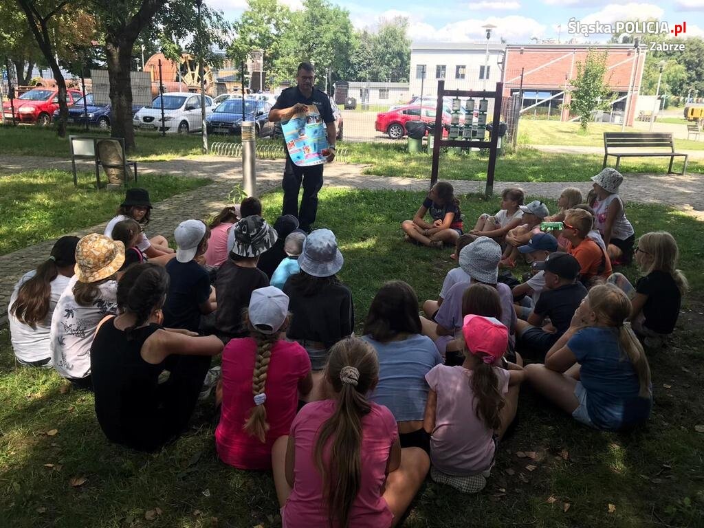 Trwa wakacyjna kampania profilaktyczna „Bezpieczne wakacje”. W ramach tego przedsięwzięcia policyjni profilaktycy prowadzą prelekcje dla dzieci dotyczące bezpieczeństwa podczas wakacyjnych zabaw i wypoczynku. Tym razem zabrzański mundurowy gościł w Parku 12C Sztolni Królowa Luiza, gdzie spotkał się z uczestnikami zorganizowanych tam półkolonii.