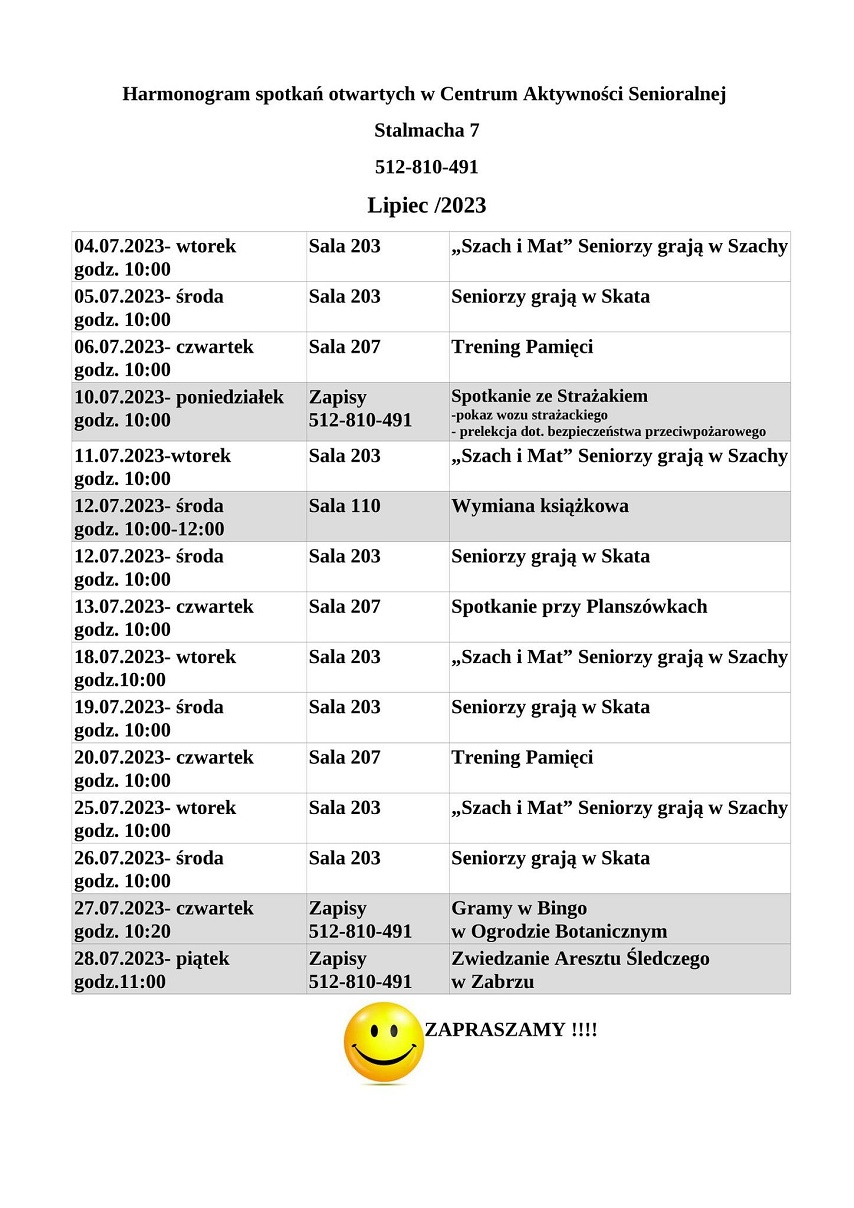 CAS zachęca również do udziału w cyklicznych zajęciach dedykowanych seniorom w Centrum Aktywności Senioralnej w Zabrzu. Chętni mogą uczestniczyć w spotkaniach szachowych, gry w skata czy treningu pamięci. Poniżej harmonogram wszystkich zajęć na lipiec bieżącego roku.