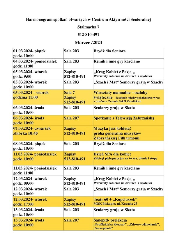 W czwartek, 7 marca, chętni wezmą udział w próbie generalnej koncertu muzyków zabrzańskiej Filharmonii z okazji Dnia Kobiet. Seniorki będą mogły również skorzystać 11 marca z zabiegów pielęgnacyjnych podczas Dnia SPA. 17 marca, w Dzielnicowym Ośrodku Kultury w Biskupicach, odbędzie się spektakl pn. „Kopciuszek” w wykonaniu Teatru 60+. Natomiast 13 marca, w siedzibie CUS, sanepid poprowadzi prelekcję na temat profilaktyki przeciw kleszczom, zdrowego odżywiania i szczepień.