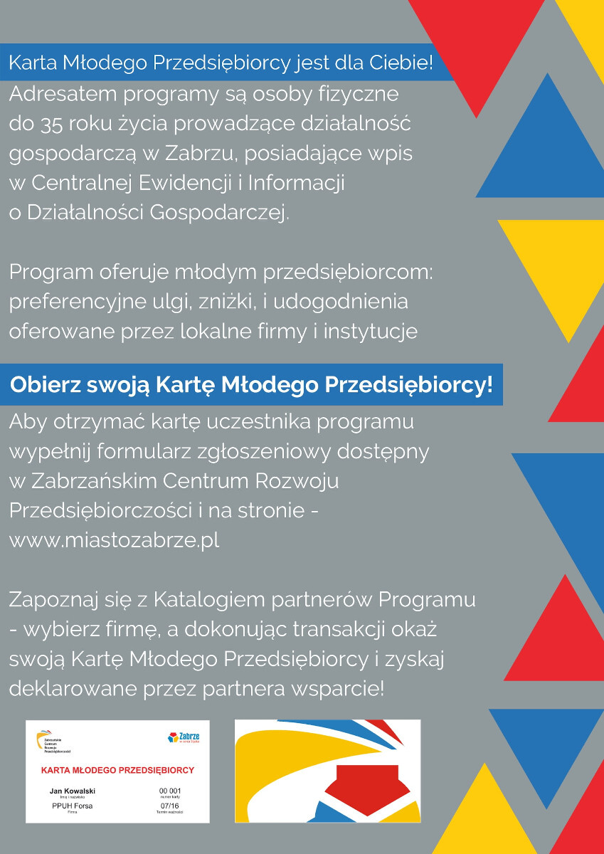 Zapraszamy młodych przedsiębiorców do skorzystania z oferowanych zniżek, a firmy zainteresowane rolą partnera do zgłaszania się w Zabrzańskim Centrum Rozwoju Przedsiębiorczości w Zabrzu.