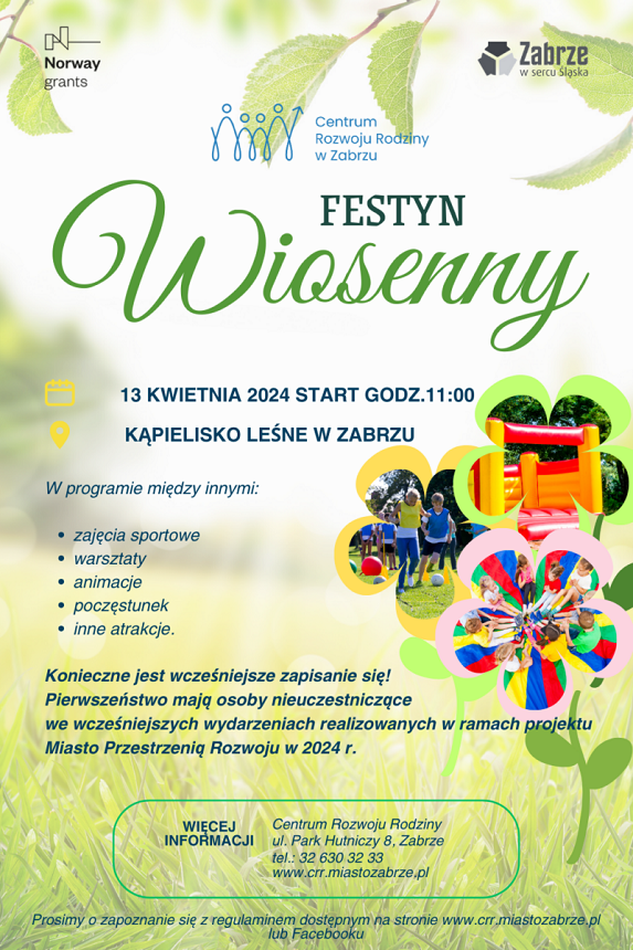 13 kwietnia, na terenie Kąpieliska Leśnego w Zabrzu-Maciejowie, odbędzie się „Festyn wiosenny” organizowany przez Centrum Rozwoju Rodziny w Zabrzu. Wśród atrakcji nie zabraknie zajęć sportowych, animacji, warsztatów czy też okazji do zrobienia pamiątkowych zdjęć w fotobudce.