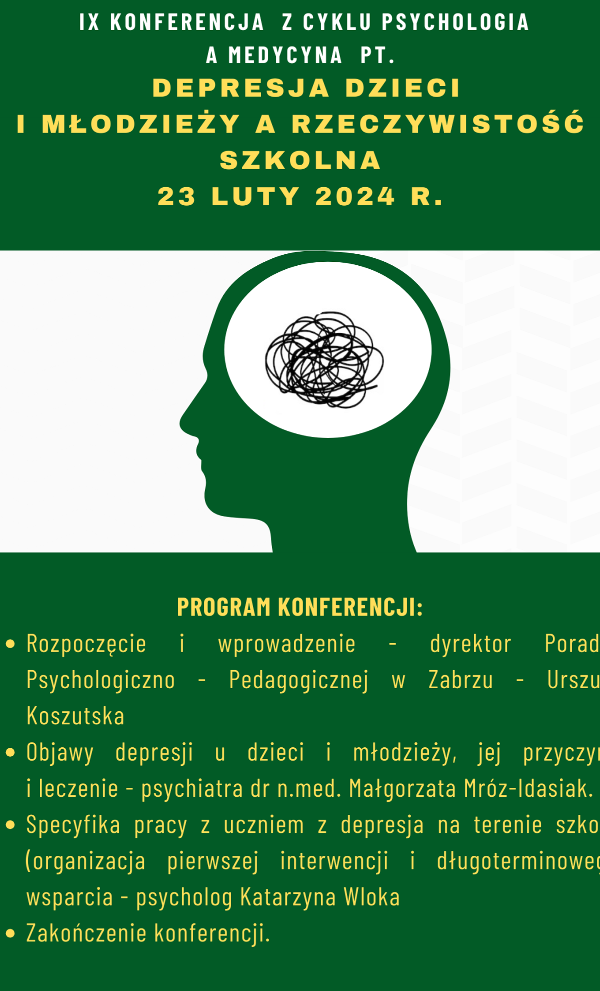 Poradnia Psychologiczno-Pedagogiczna w Zabrzu zaprasza na IX Konferencję z cyklu "Psychologia a Medycyna" pt. „Depresja dzieci i młodzieży a rzeczywistość szkolna”. Wydarzenie rozpocznie się 23 lutego o godz. 13.00 w Zabrzu, ul. 3 Maja 93 a.